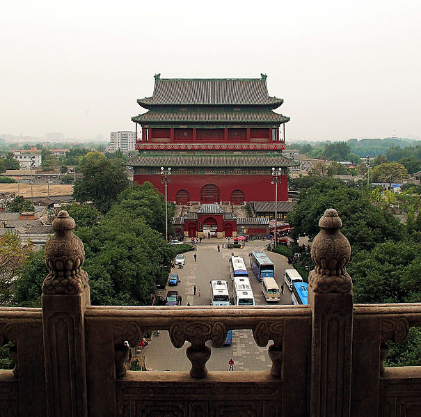 This view looks south to the Ming Dynasty (1420) drum tower, from the balcony of the bell tower (previous page).