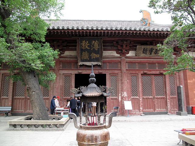 Huayan Temple, as we see it today, dates from the Liao and Jin dynasties (11th and 12th centuries) and later, although it may have been founded as early as Tang or even Northern Wei. The temple is built on two levels. The lower level houses the Sutra Hall and Datong City Museum, while the Main Hall is on the upper level. Huayan Buddhism is based on the Flower Garden Sutra and was influential at Baodingshan. The Sutra Hall (Bojia Jiao Zang Dian) is the temple's library. It houses 38 sutra cabinets that are constructed like miniature buildings of the period; there are also three notable Liao sculptural groups, with Shakyamuni, Maitreya, Amitabha, and Bodhisattvas on the altar. The building is five bays wide, with a hip-gable roof. |