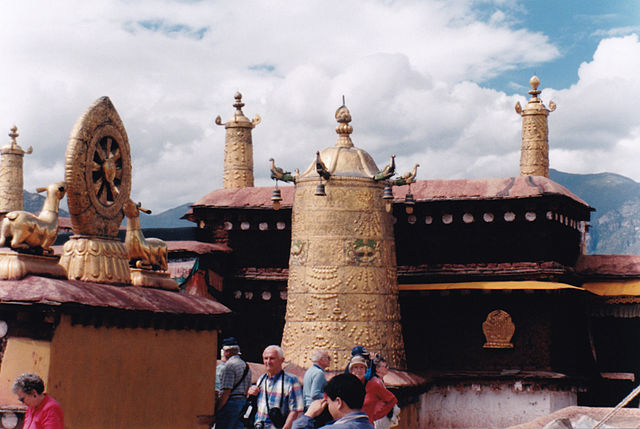 Rooftop ViewJokhang Temple, Lhasa, Tibet Decorations seen here are the deer-park motif (photo left) and several dhvaja. These "Victory Banners" are derived from military standards. They symbolize the political-religious triumph of Buddhism in Tibet, and are also considered apotropaic (protecting against evil). They are typically found on rooftops and above gateways, and are made of gilt copper, gold-painted wood, or cloth. See the following page for several examples. |