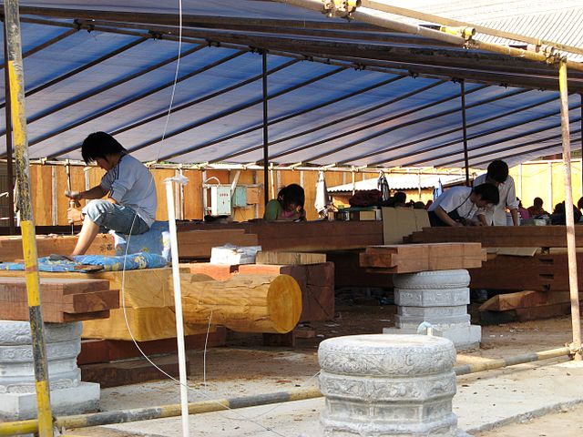These workers are building a new Buddha Hall for the Great Goose Pagoda in Xi'an. Traditional techniques of wood construction include mortise and tenon joints, visible here and there in the photograph.