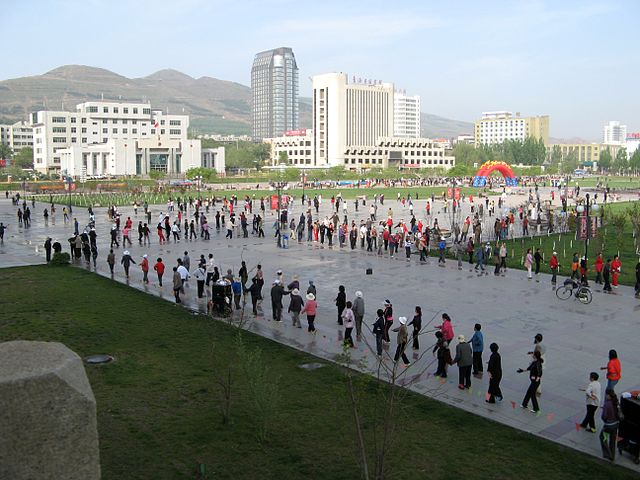 It is the custom of Chinese people to perform early-morning group exercises in the local parks. Here, several different groups perform synchronized dance steps in the Xining park in front of the Qinghai Museum (left, out of photo).