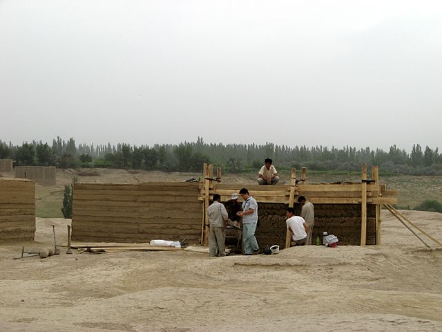The archaeological researchers in this photo are investigating the construction of pounded-earth walls,