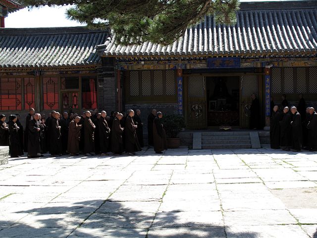 Although dressed like monks, this is actually a group of Buddhist laypeople (including both men and women) who have come to Bishan Si on Mount Wutai to express their devotion by chanting sutras.
