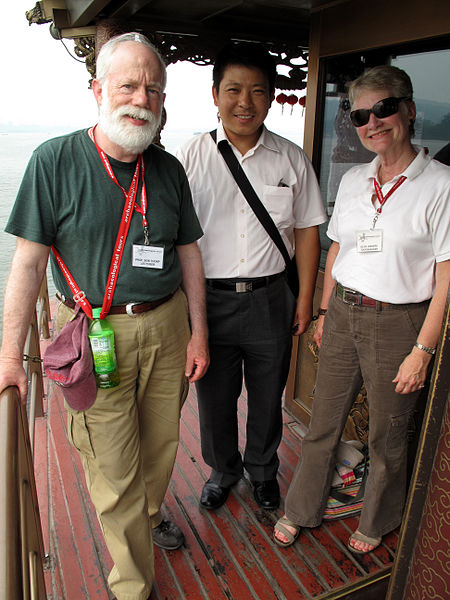 Shown in this photo are tour lecturer Bob Thorp; China National Guide Mr. Du; and tour manager Alice Lengers. The setting is a boat ride on Hangzhou's West Lake (May, 2009).