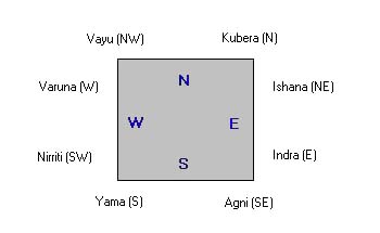 Dikpalas, or directional guardians, are stationed around the four corners of many temples. The southeast corner, with guardians Indra (E, photo right) and Agni (SE, photo left), is shown here.