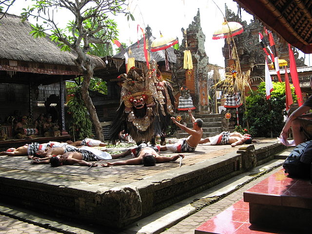 The Barong revives his helpers after they have been overthrown by Rangda; "Get up, get up!" he seems to be saying. The Barong's expressions seem varied and lifelike as the drama moves along.