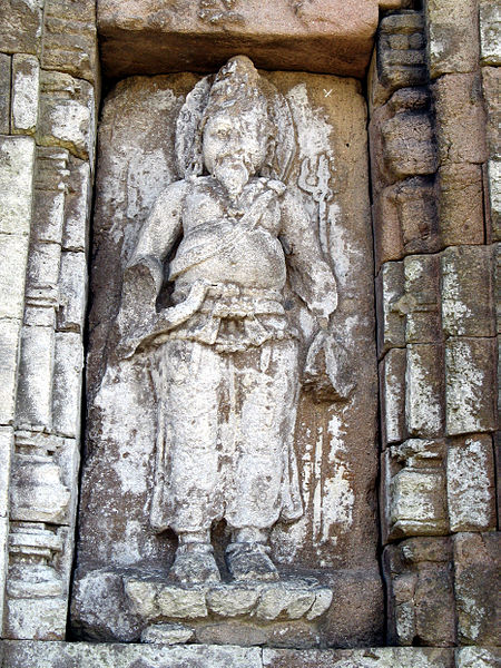 AgastyaLarger Shiva Temple, Gedong Songo III The south niche is occupied by Agastya, a legendary missionary of Shiva in India who eventually became regarded as an avatar of the god himself. The potbellied and bearded guru stands on a lotus throne. His arms and the attributes they carried are broken off, but a clear outline of Shiva's trident is visible at the statue's proper left side. |