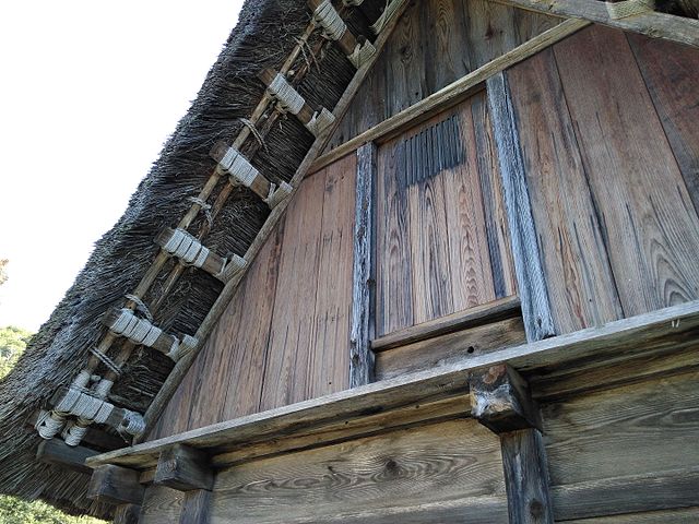 This photo illustrates the nail-less construction in Shirakawa. The roof poles are tied together by rice ropes, and other boards are fitted by interlocking joinery.