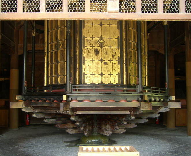 The Kyozo (sutra hall) features an octagonal revolving sutra case, shown here, that visitors are allowed to spin. In popular Buddhism, spinning a sutra case is like reading the sutras, just as spinning a prayer wheel is like saying the prayer. The revolving case dates to 1694, and the building itself to 1759, so that the case predates the hall. |