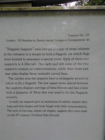 These granite flagpole supports (danggan-jiju) are located just beyond the Iljumun gate. they are 4.8m (15.75ft) tall, and date to the 9th century, according to the sign. There are actually two ways of using danggan. With one pair, as here, a streaming narrow banner is hoisted up the flagpole to announce special events. With two pairs, a horizontal pole is suspended between two flagpoles. Banners painted with Buddhist images are draped over the horizontal pole, to provide a focus of worship on special days when there are too many worshipers to fit inside the temple halls1.