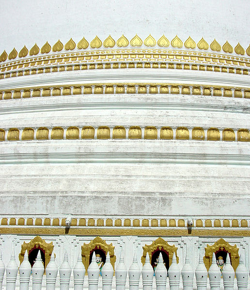 At the base of the dome, there are niches with statues of the Buddha. Rainspouts interrupt the lozenge band above the niches.