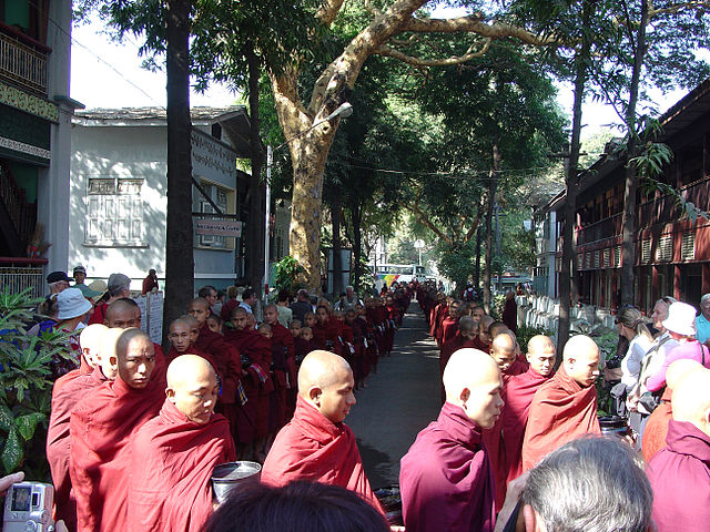 These monks lining up for their noon meal do not seem too disconcerted by the hordes of tourists.