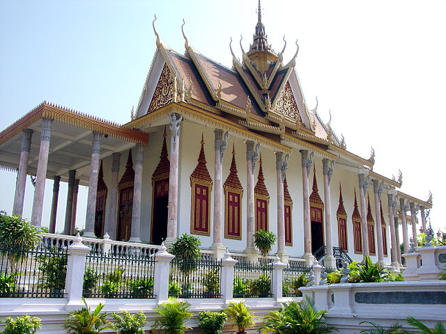 The official name of this temple, Wat Preah Keo Morokat, translates to "Temple of the Emerald Buddha." This refers to a statue inside, but it is not the same as the famous Emerald Buddha in Thailand. The Cambodian temple is popularly known as the "Silver Pagoda" bacause of the thousands of silver tiles which cover the floor of its interior. The temple complex contains several buildings; its main hall is shown here. The Tripitaka Library next door holds an important early sculpture of Nandi ("Preah Ko," Shiva's Sacred Bull). The complex is surrounded by a gallery that is painted with scenes from the Ramayana (next page). "Morokat" and "Morakot" (both meaning "emerald") are alternate spellings; look up both if you are doing web searches. |